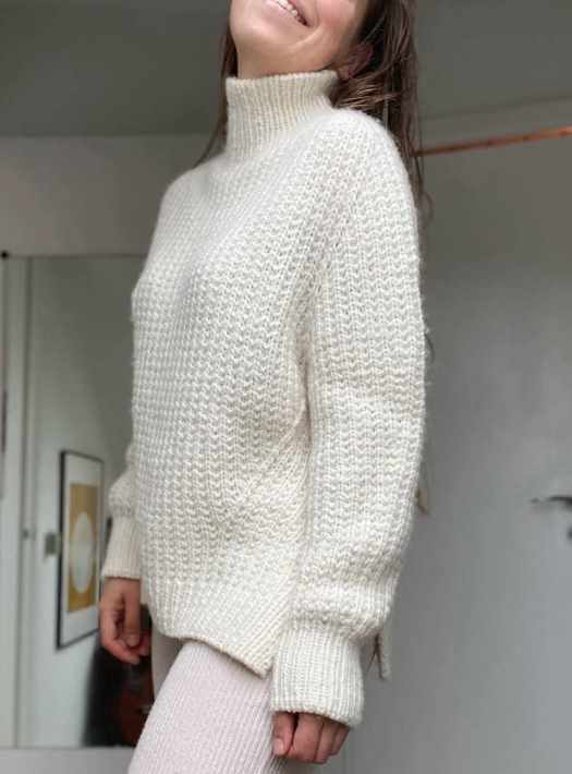 Свитер вяжется сверху вниз, росток формируется укороченными рядами, а кокетка формируется с тремя типами прибавок, чтобы сформировать плечо-погон и красивый рукав. После этого петли рукавов снимаются на удержание, и тело вяжется с прибавками и убавками, чтобы создать иллюзию "приталивания", которая переходит с боковых сторон на перед. В конце, тело делится на перед и спинку, каждая из которых вяжется поворотными рядами и заканчивается высокой резинкой по нижнему краю. Затем петли рукава...
